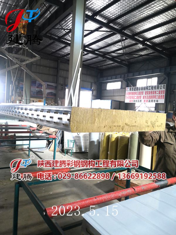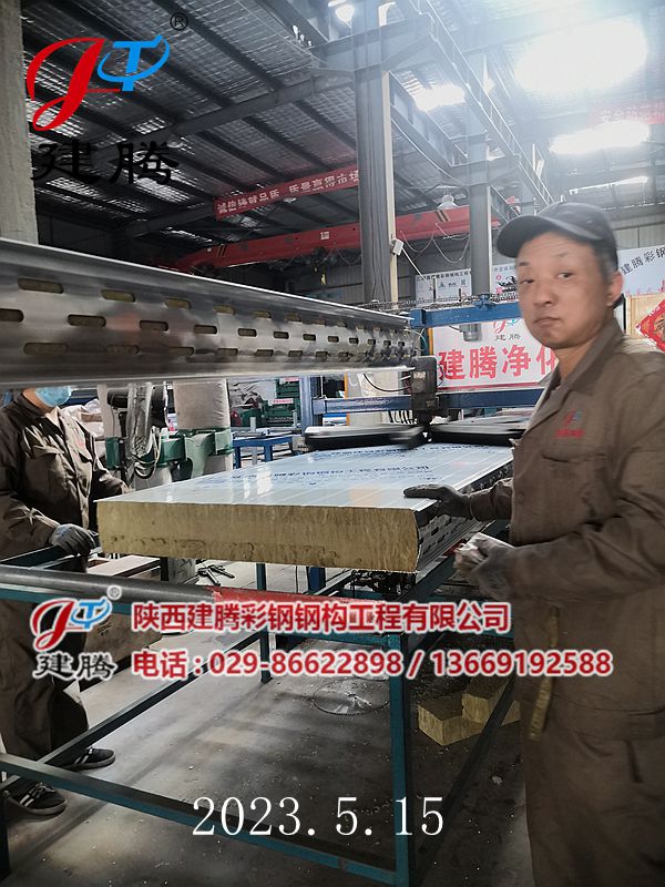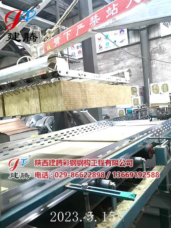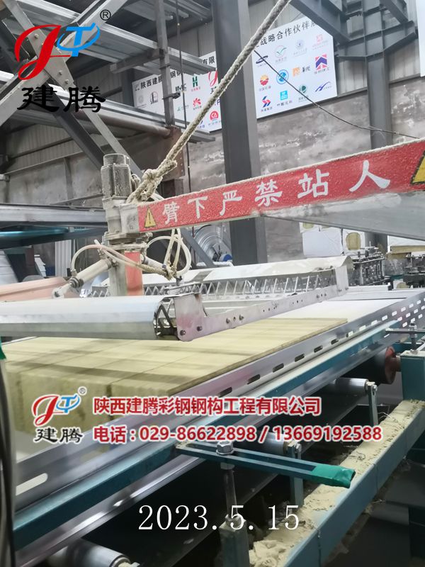 2023.5.15 150厚巖棉120公斤容重彩鋼烘道夾芯板生產中