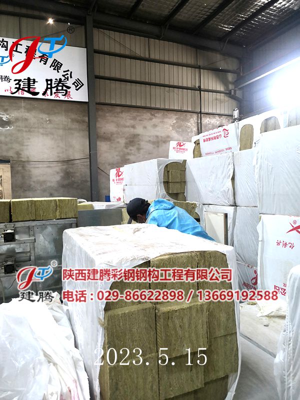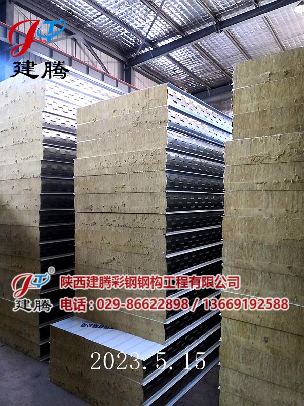 2023.5.16150厚巖棉120公斤容重彩鋼烘道夾芯板裝車中